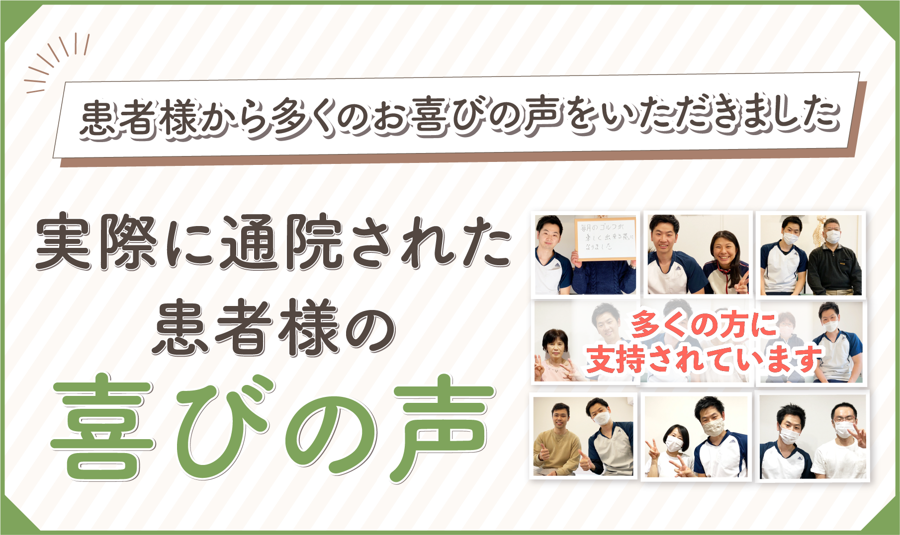 当院は多数の口コミを頂いている整体院です。毎月たくさんの患者さんが腰痛を改善されています。