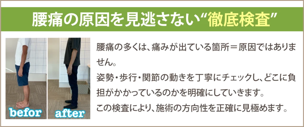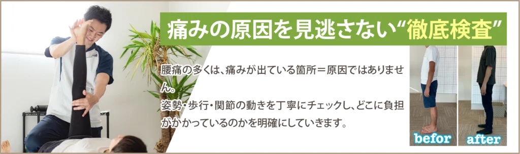 まずはあなたの腰痛の原因をしっかり検査していきます。カウンセリング時に体のバランス、生活環境などをお聞きしてなぜ痛みが出ているかをしっかり把握していきます。