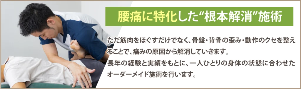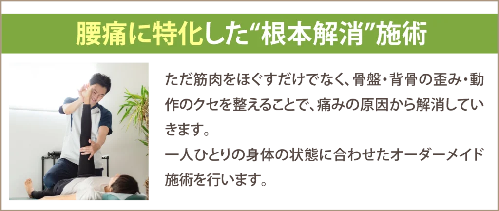 一人ひとりのカラダに合わせたオーダーメイド整体そしてセルフケアをお伝えしていきますので腰痛が再発しないカラダを手に入れる事ができます。