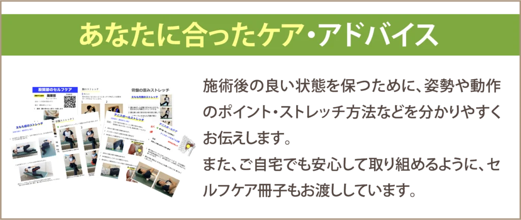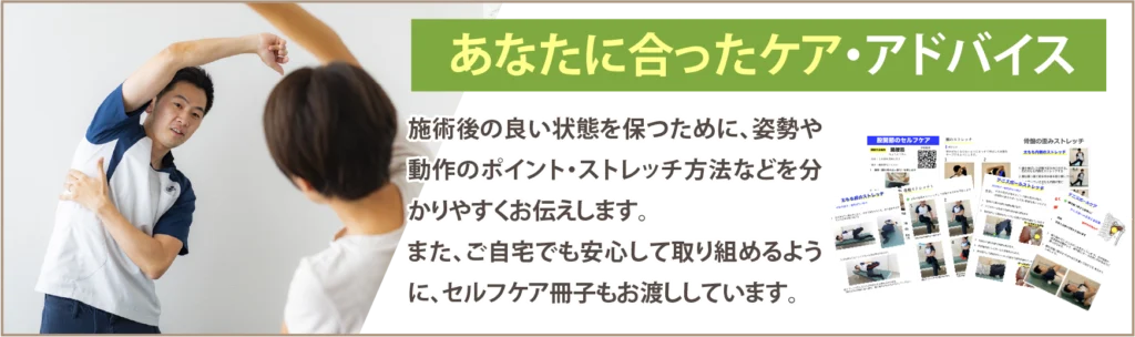 良い状態を保つためには、施術だけでなく、セルフケアや意識が必須になります。
